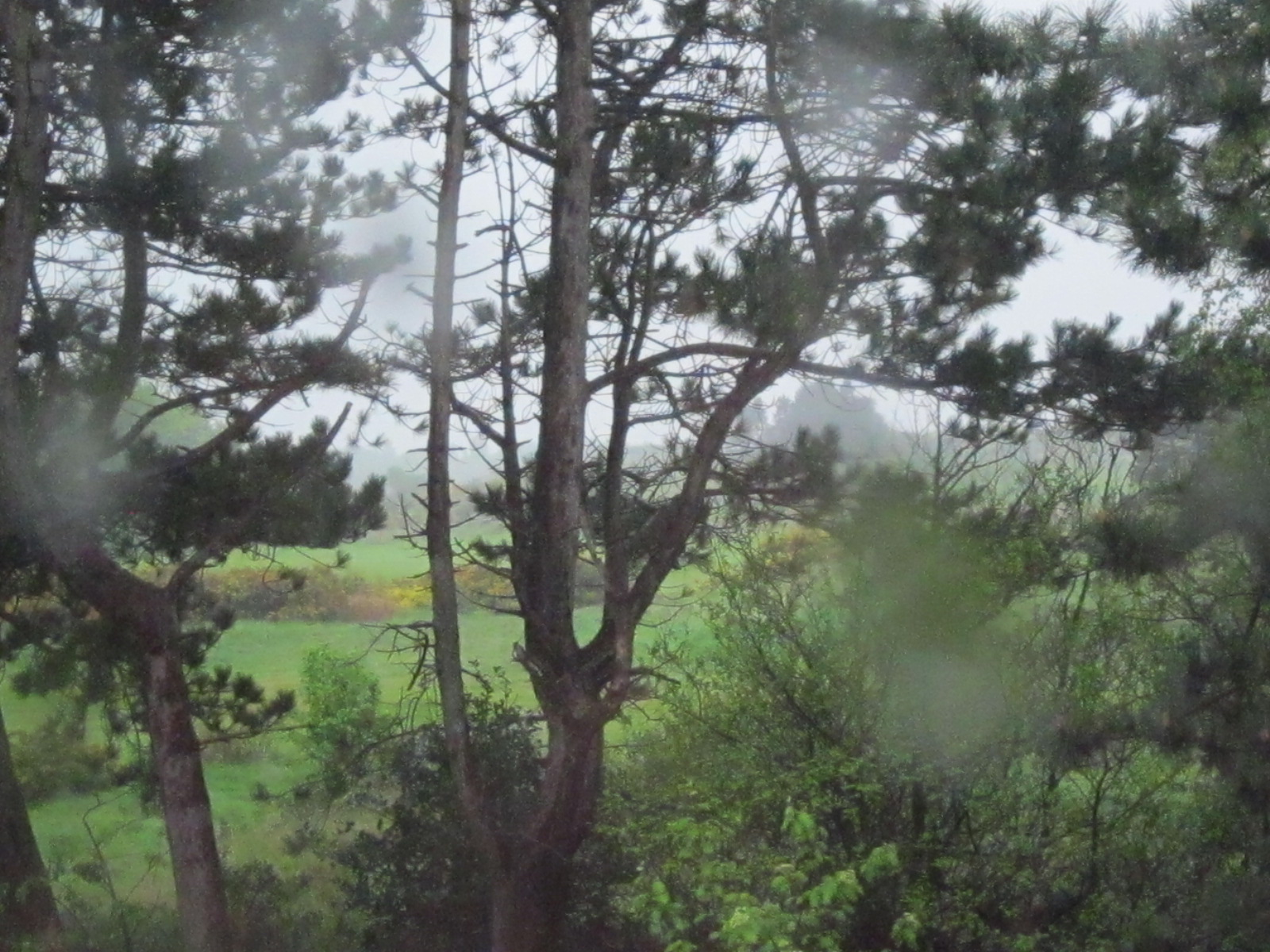 A six-carriage train, like a long yellow caterpillar, glides through the distant gorse, appears briefly, then disappears into the trees.