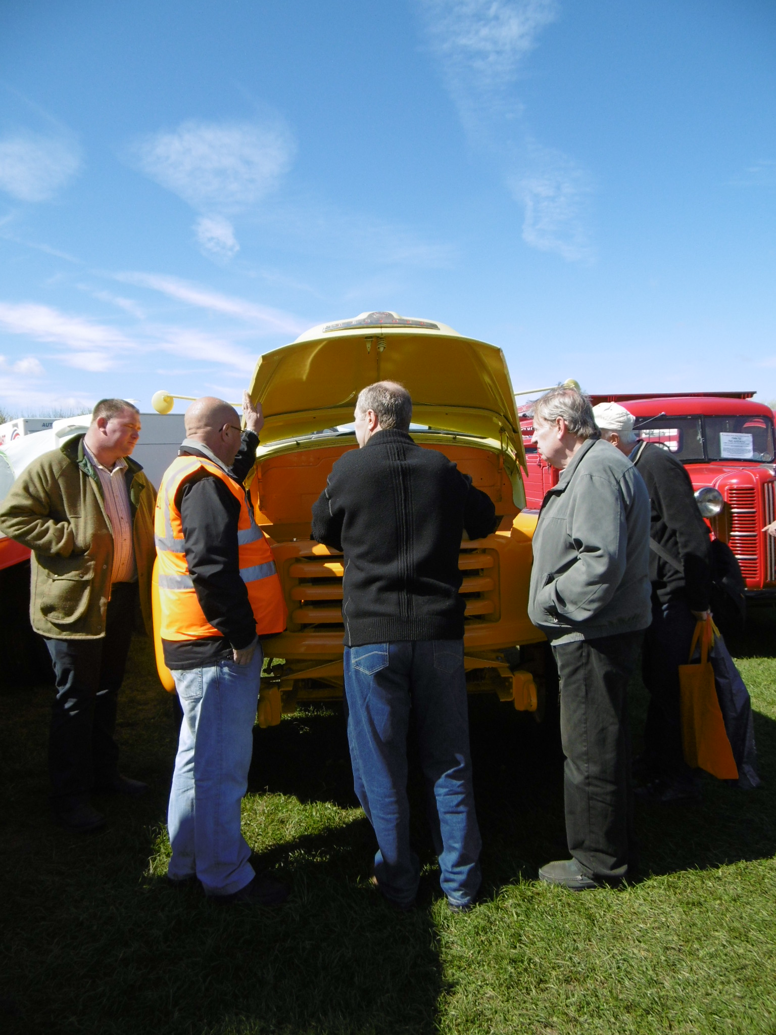 A bright yellow vehicle catches our eyes. Two men chat in broad northern accents about the engine. The owner lifts the bonnet. Within seconds a crowd has gathered, men hovering around the yellow engine, like fruit flies round a decaying banana.