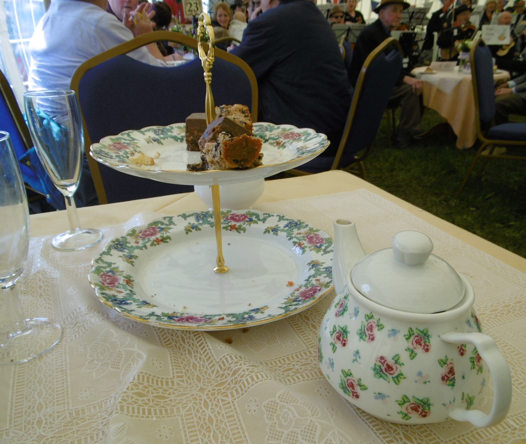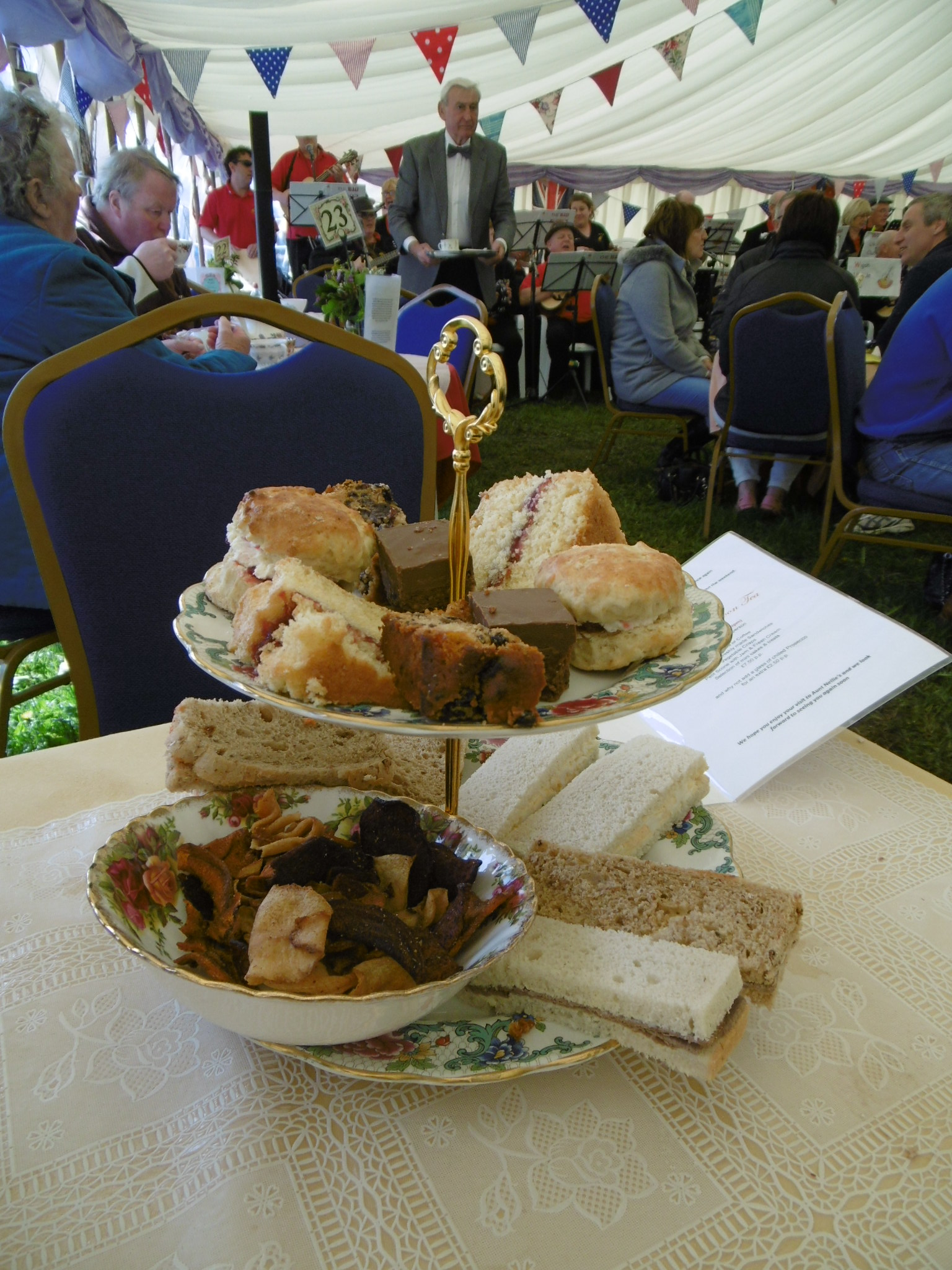 Sandwiches and vegetable crisps, scones with jam and cream, Victoria sponge and fruit cake – it’s all too much. We leave a little and waddle our way past the band, with regret.