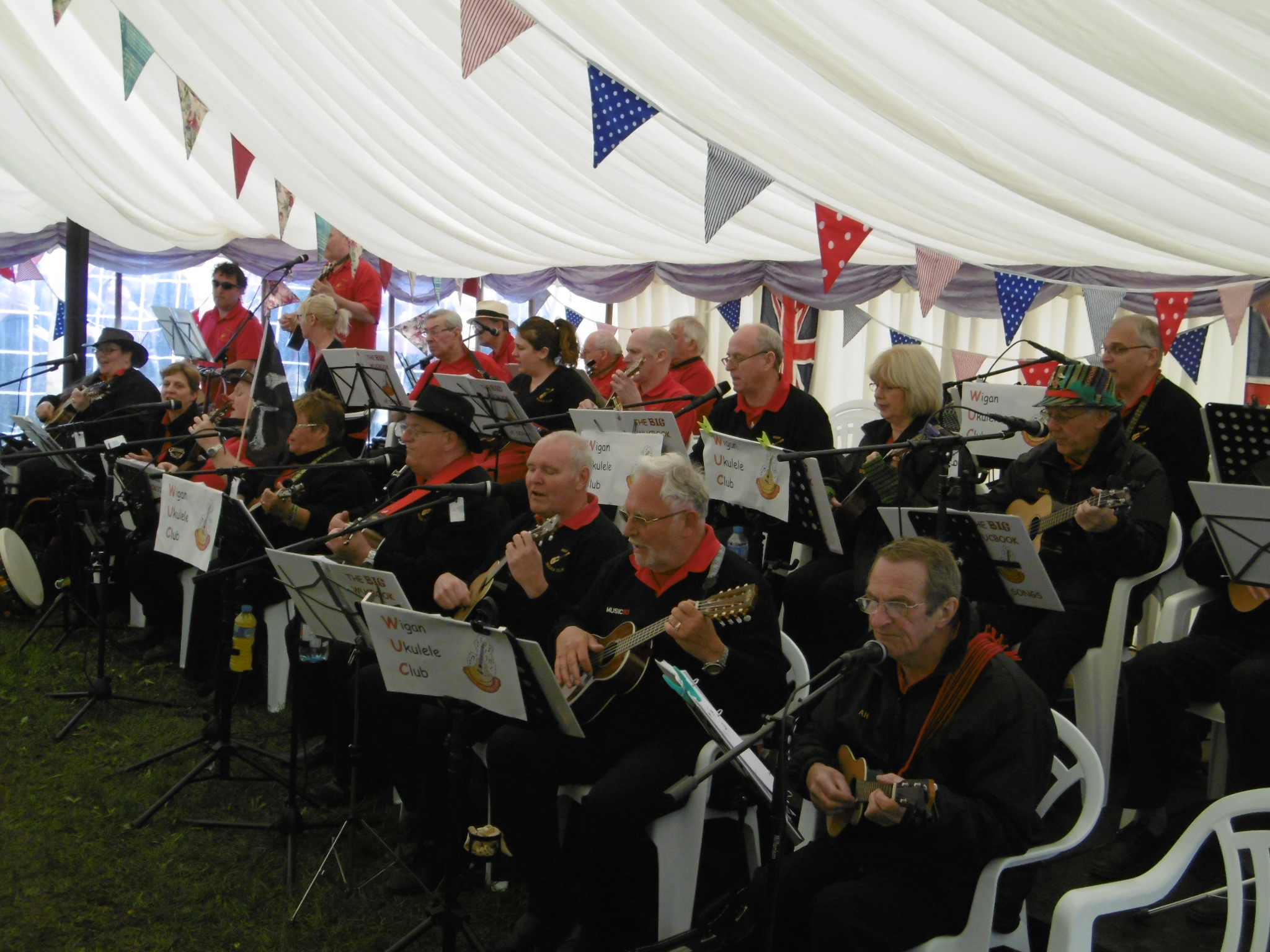 All across one side of the tent, starting beside the customers queueing for tables, sit the ukulele strummers.