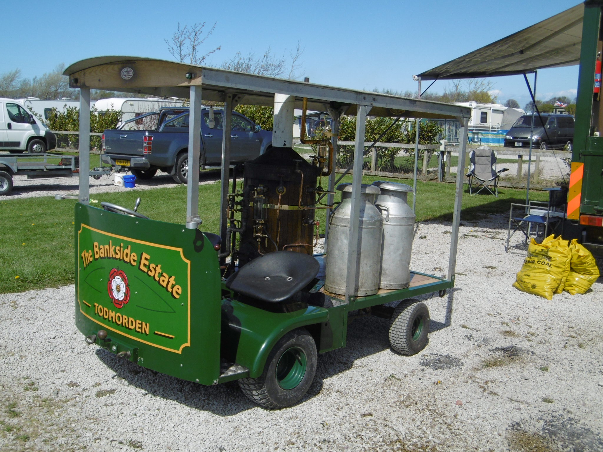 A steam powered milk float – the cylinder on board looks very like the pump the Navy ordered in 1944 to me … well, it’s wood and brass!