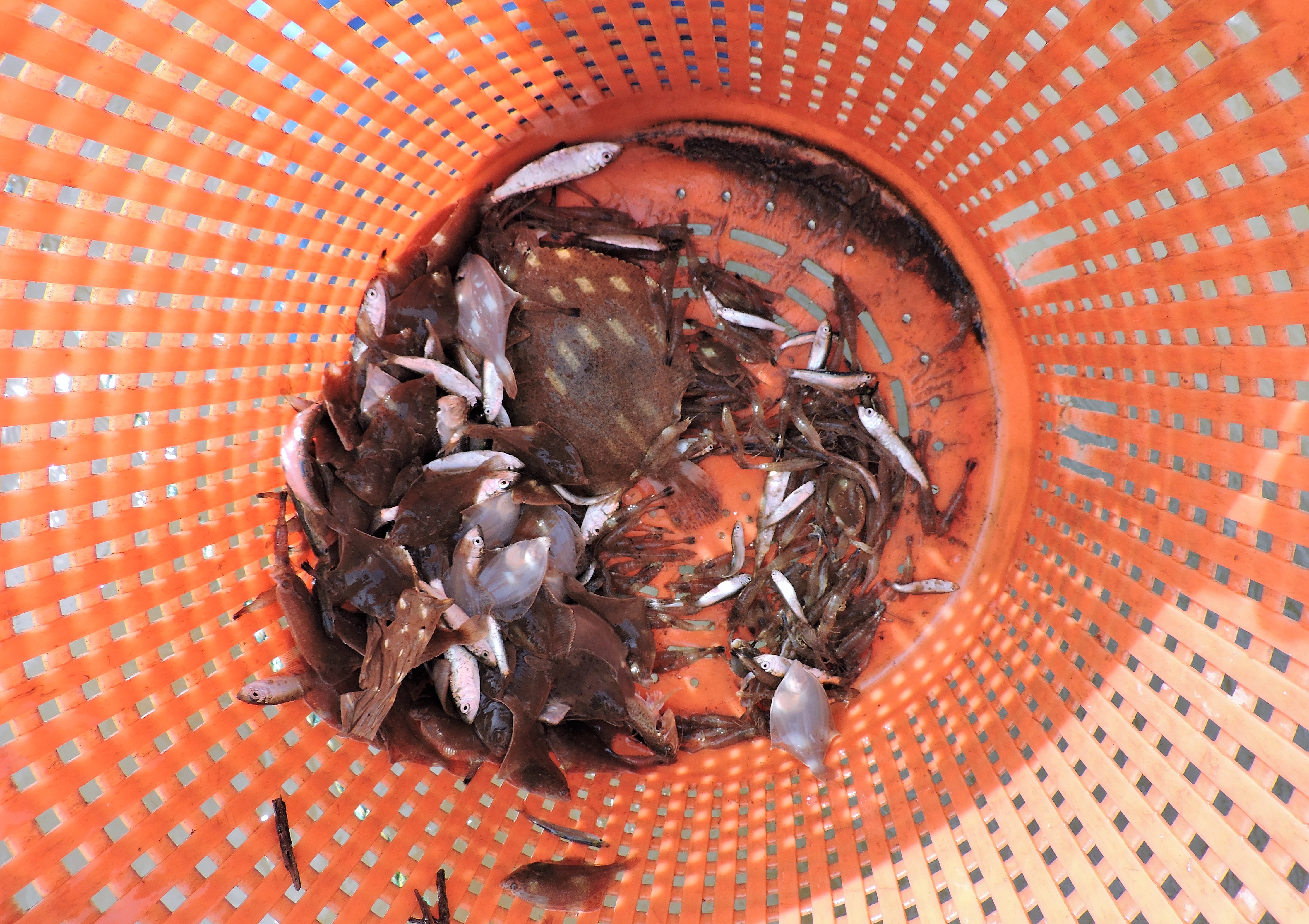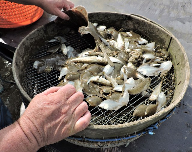 The two nets were disgorged into orange baskets, then into different mesh-sized sieves for sorting. It was sad to see the little flat fish puffing for breath as they landed the wrong side up (and sweet to see soft-hearted best beloved flipping them over as fast as he could).