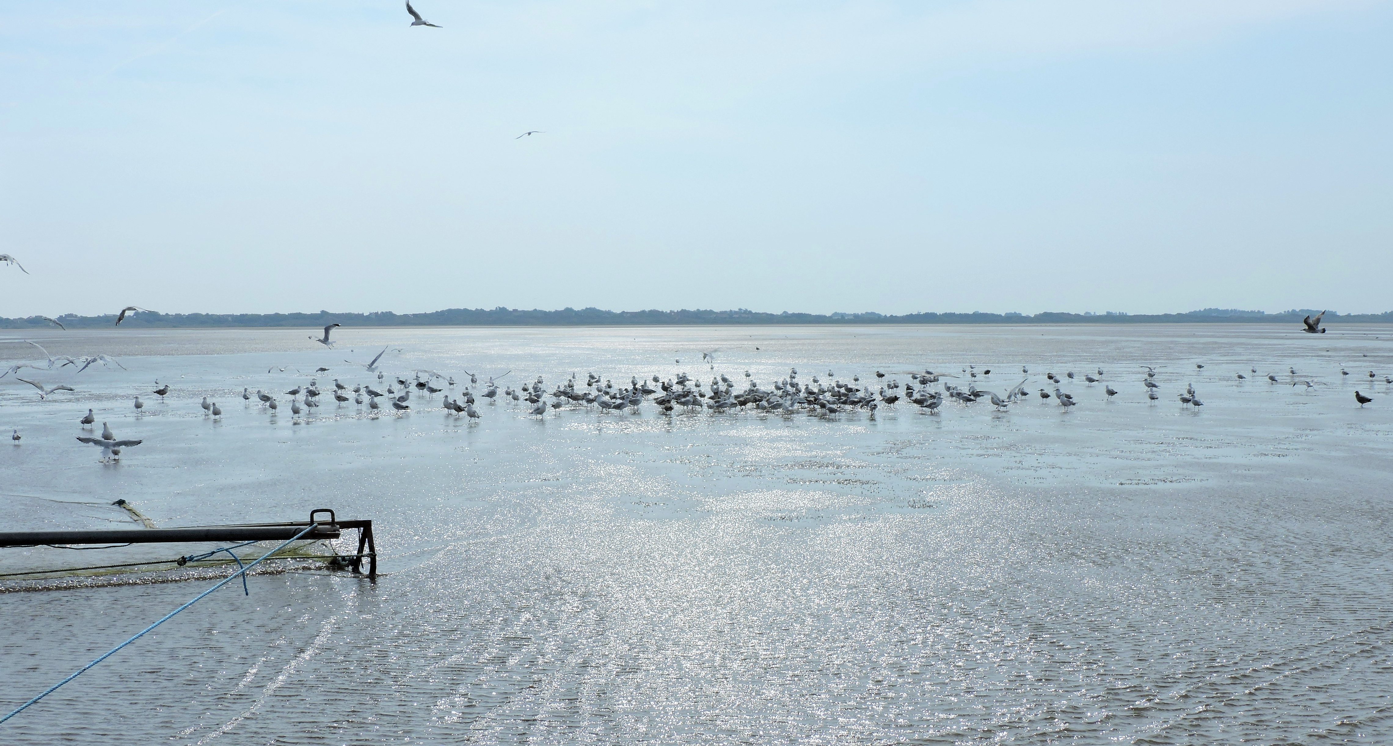 Eventually the brown waves (aftermath of all that rain) were nibbling at the wheels and we stopped while Kevin adjusted his nets.