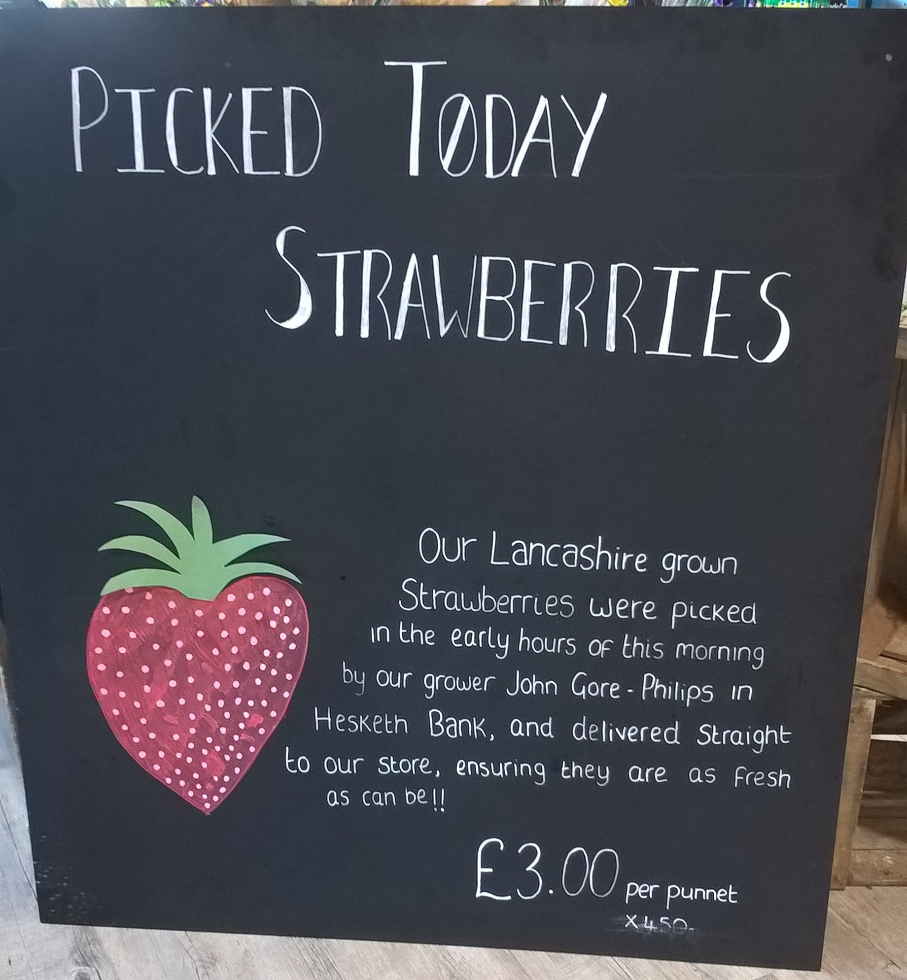 Yesterday he had a choice of three types of strawberry. One lot came from Scotland – they’re usually pretty good. One lot came from another county in England. One lot came from just down the road. You can guess which I bought.