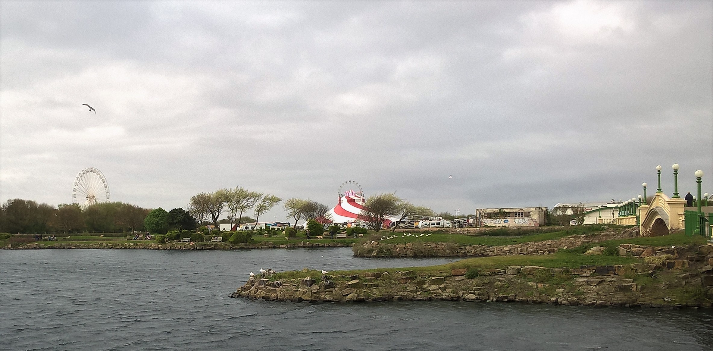 It was a bad day for photography, sorry. But you get the idea. Pretty bridge, big top of the visiting circus, big wheel back for the summer at Pleasureland, cold water, grey skies – and seagulls