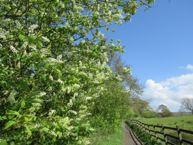 The quiet lane froths with scented blossom.
