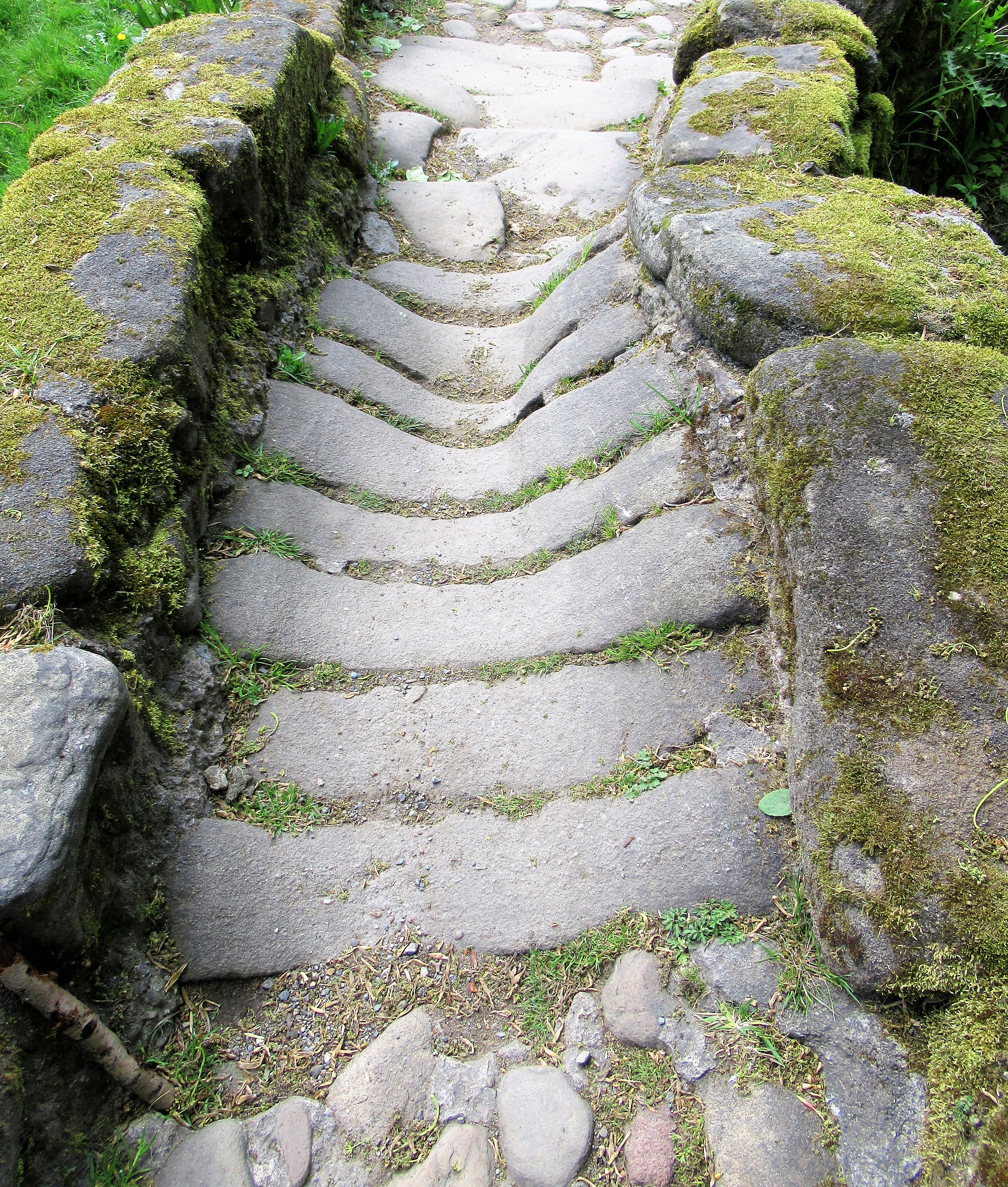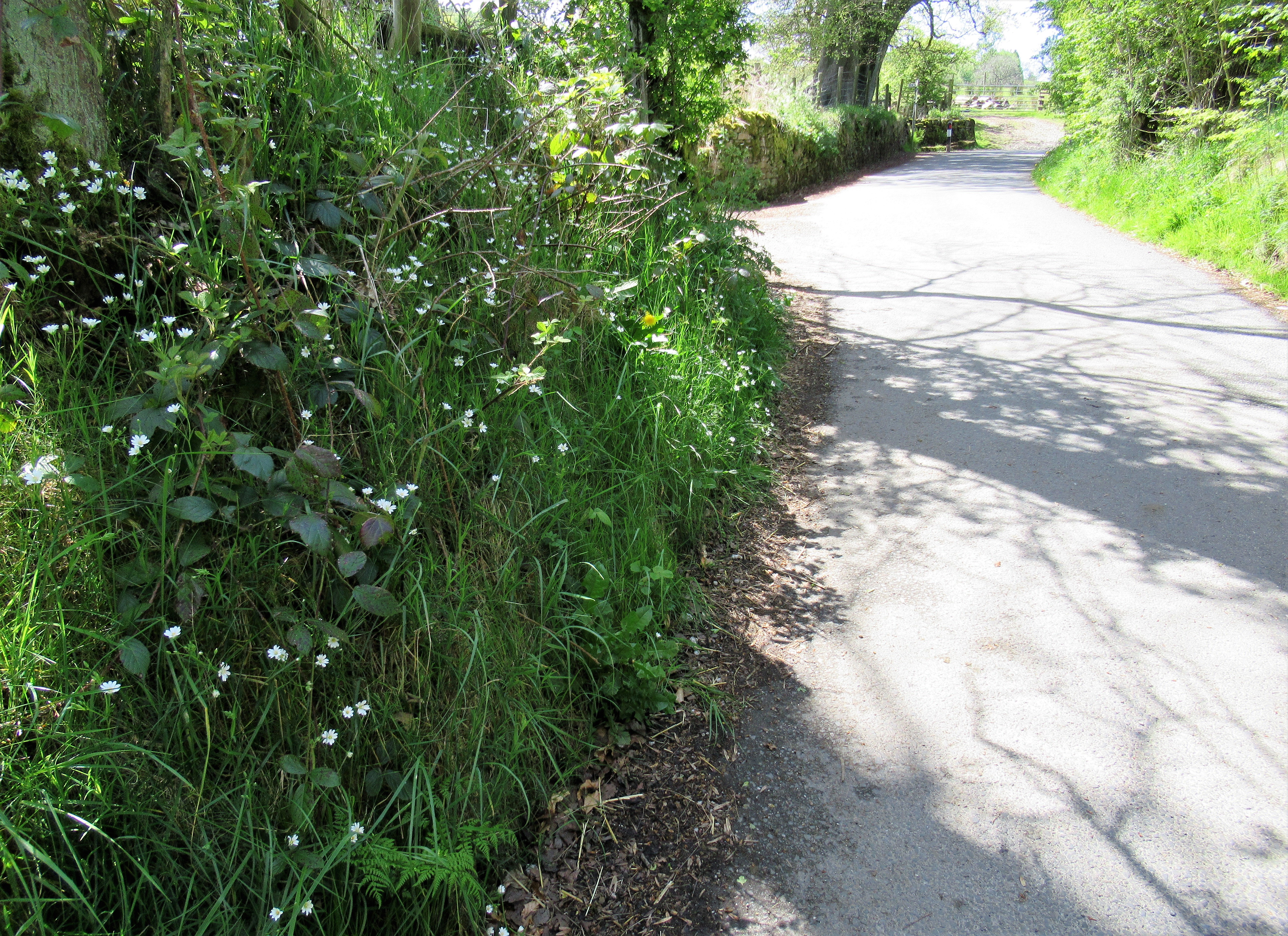 Tiny white flowers I can’t identify gleam in the shadowy verges, under moss-dressed dry-stone walls.