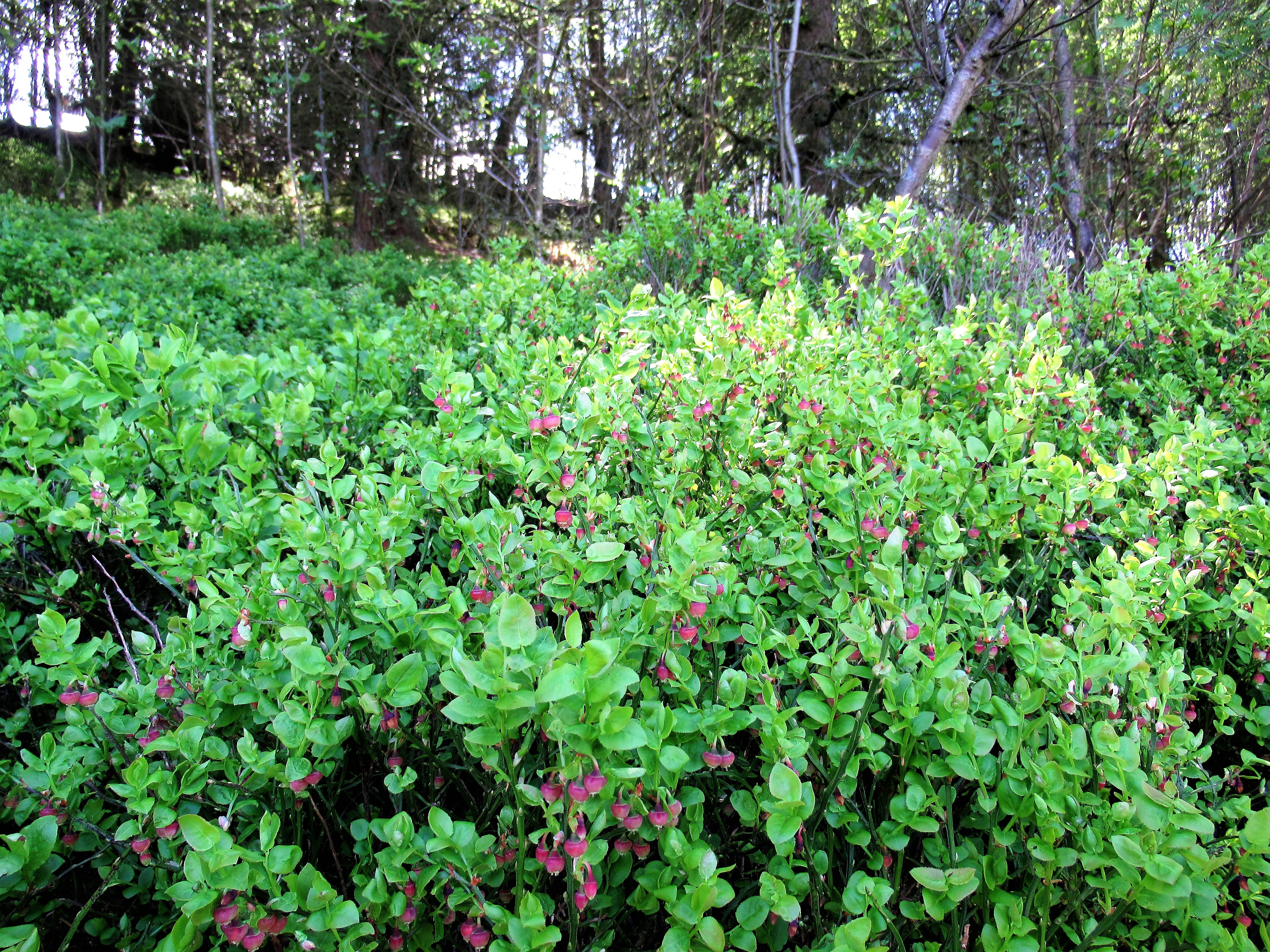 Past holly, late in berry and evergreen trees with tiny, pineapple-like cones. Past whinberries, blushing pink and far from ripe.