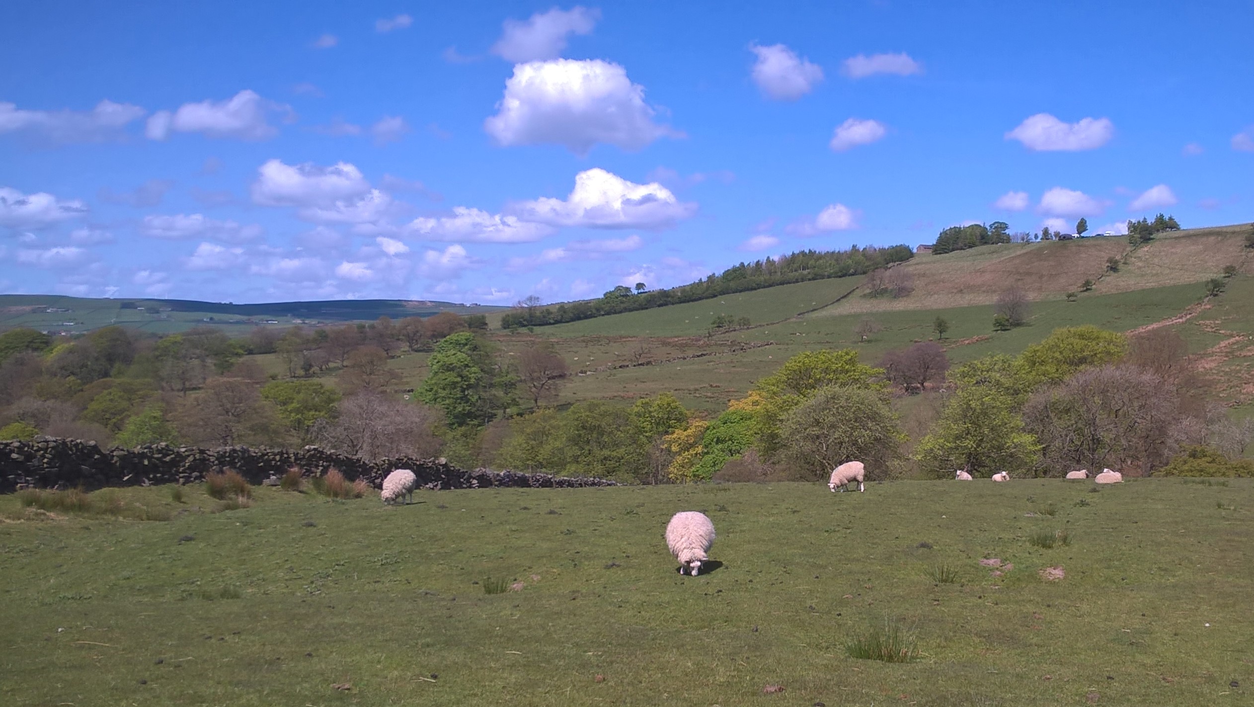I cross another stone bridge and pass through the first walker’s gate. Head uphill, through placid sheep and lambs.