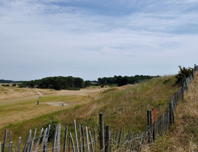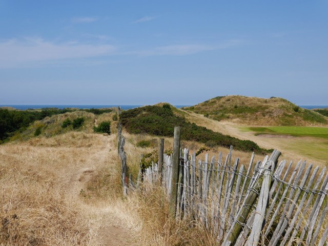 Beginning the walk, up the first hill, hot, soft, dry sand and the golf course fence bleached in the sun