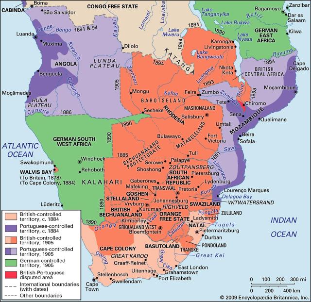 Map of colonial southern Africa in 1905, from Encyclopedia Britannica online
