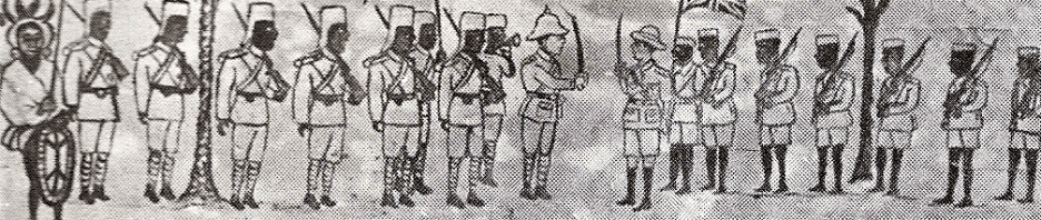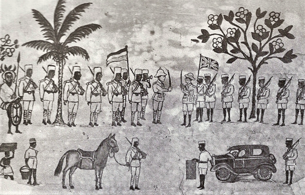 The surrender to the British by General Paul von Lettow-Vorbeck at Abercorn, now Mbala, Northern Rhodesia, now Zambia, as seen by an anonymous African artist. Picture held by the National Museum of Tanzania