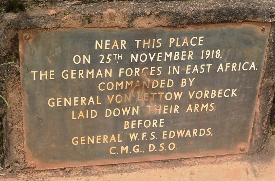 Memorial at the site of Chambeshi Bridge. It reads: “On this spot at 7.30 am on Thursday 14th November 1918, General von Lettow-Vorbeck, commanding the German forces in East Africa, heard from Mr Hector Croad, then District Commissioner Kasama, of the signing of the Armistice by the German government, which provided for the unconditional evacuation of all German forces from East Africa”. A second plaque in Bemba ends with the words: “Twapela umuchinshi kuli bonse abashipa abalwile mu nkondo iyi” – we honour all brave soldiers in this war.